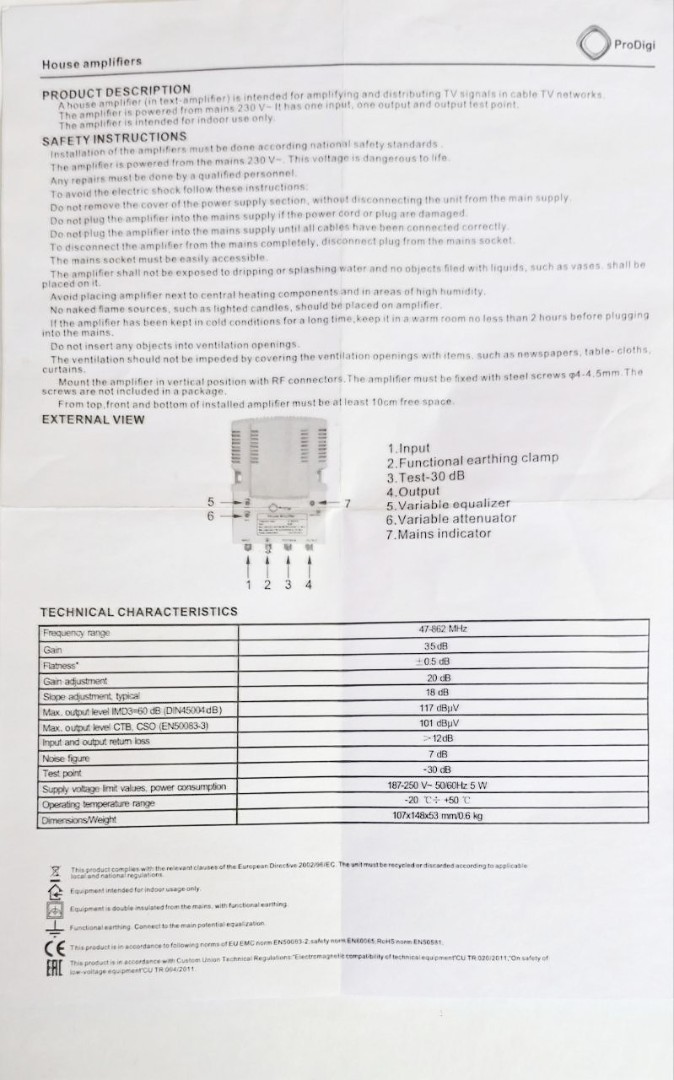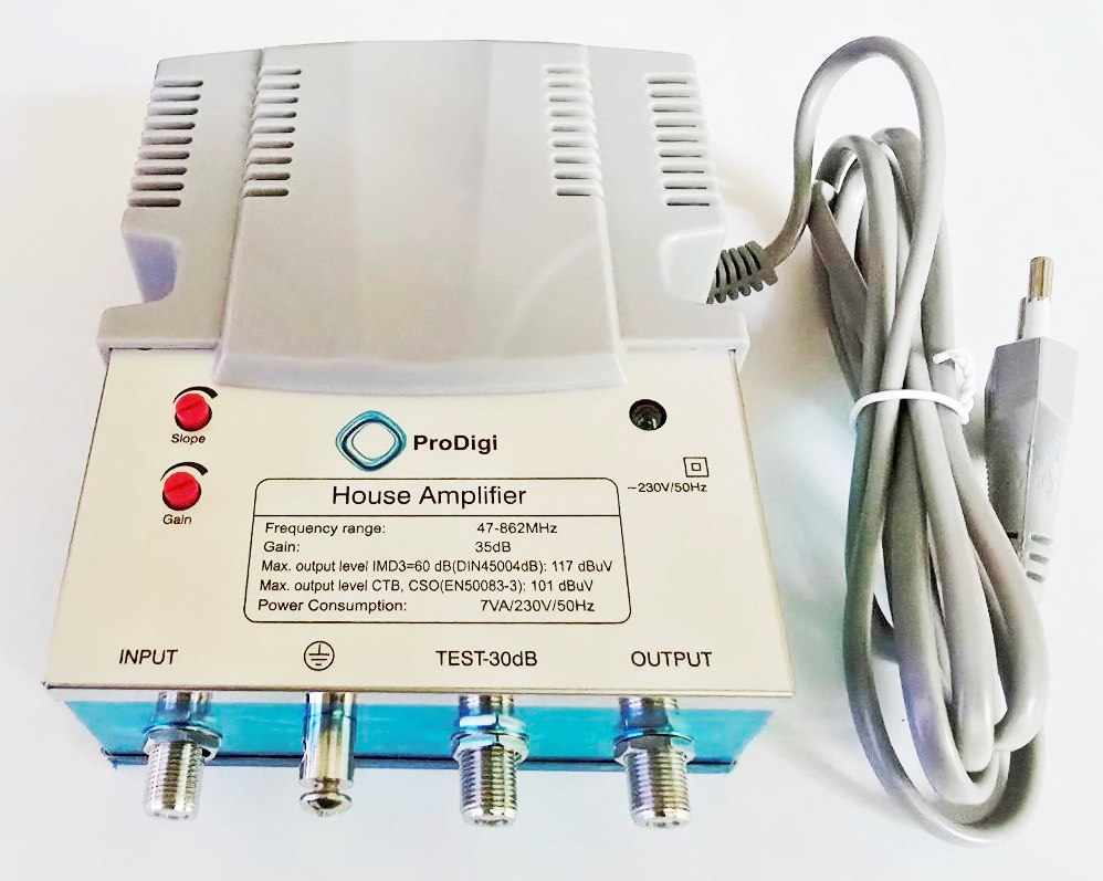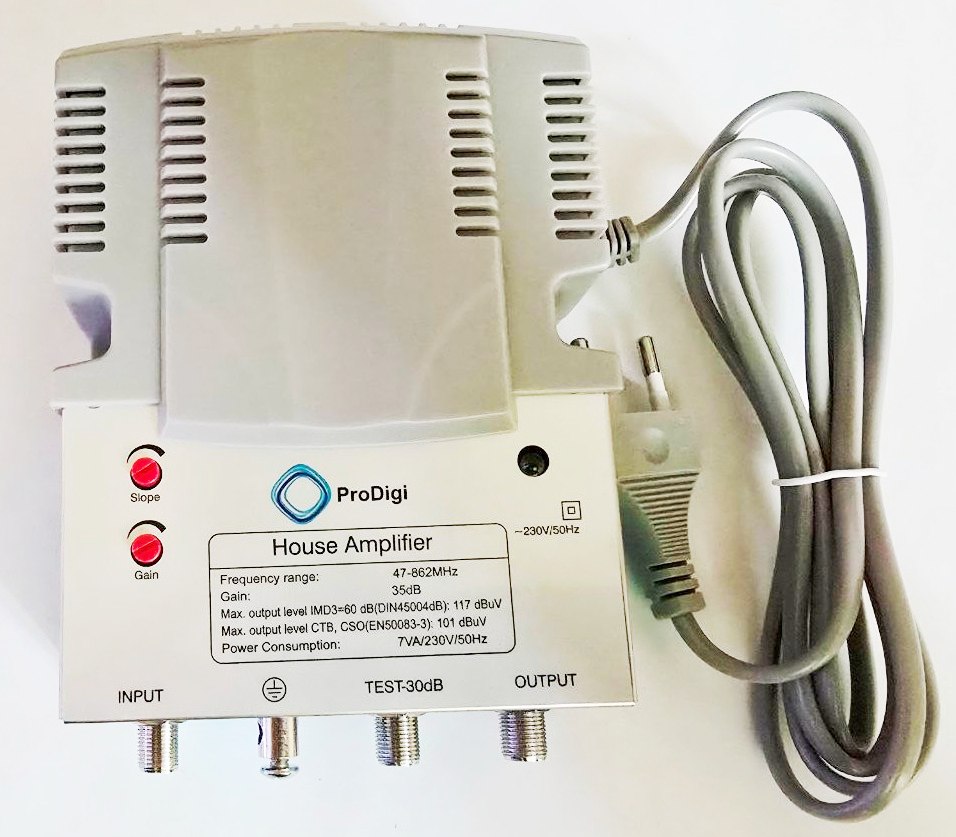 - Предназначен для усиления телевизионных сигналов с целью компенсации затухания в домовой распределительной сети, в т.ч. системы кабельного телевидения. Усилитель выполнен в стальном корпусе с антикоррозийным покрытием, обеспечивающим защиту от механических повреждений и электромагнитных помех.